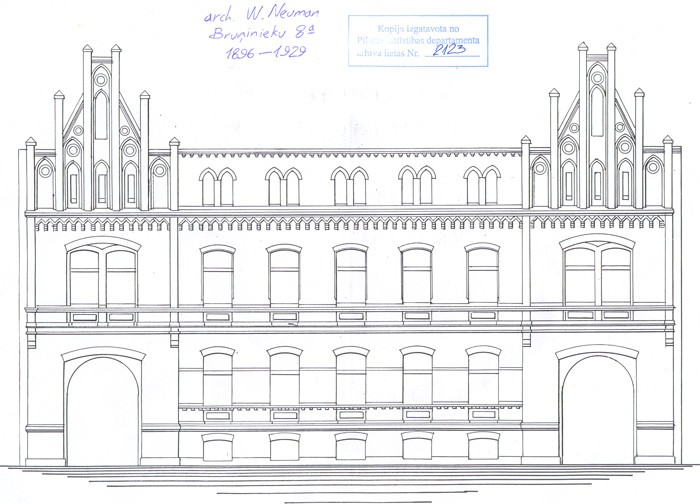 Vilhelms Neimanis Noliktavas Bruņinieku iela 8а Дом, изначально спроектированный Вильгельмом Нейманом как склад, в 1929 году был перестроен под квартиры.