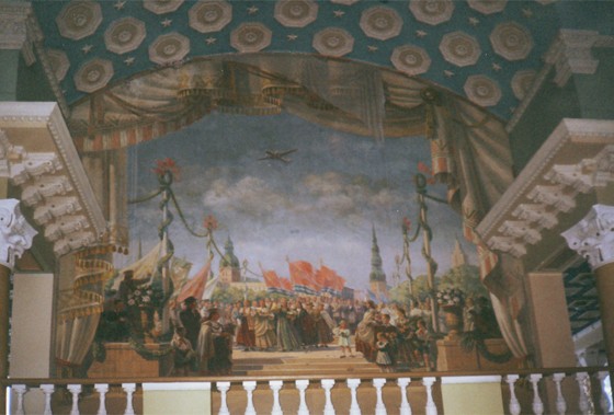 Зато мастера особенно постарались в интерьере: шутка ли, за пятьдесят лет не было ни одного капитального ремонта, но ещё почти всё выглядит так, будто здание построили если не вчера, то пару лет назад. Входящего встречает грандиозное панно в советском духе, которое должно было убеждать в большом желании латышей присоединиться к братским народам союзных республик — на ступеньках, ведущих к Даугаве, люди с радостными лицами в народных костюмах поют народные песни, сверху — аэропорт, всё-таки! — летит самолёт, на заднем плане видна панорама Старой Риги, но больше привлекает правый угол. Там изображённый Дом Колхозников, он же Академия Наук, был достроен только к 1957 году, когда картину народу показали уже с открытием аэропорта в 1954‑ом! Не говоря уж о башни церкви святого Петра, восстановленной только к 1970 году… Изображения по бокам зовут туриста в Юрмалу и Сигулду.